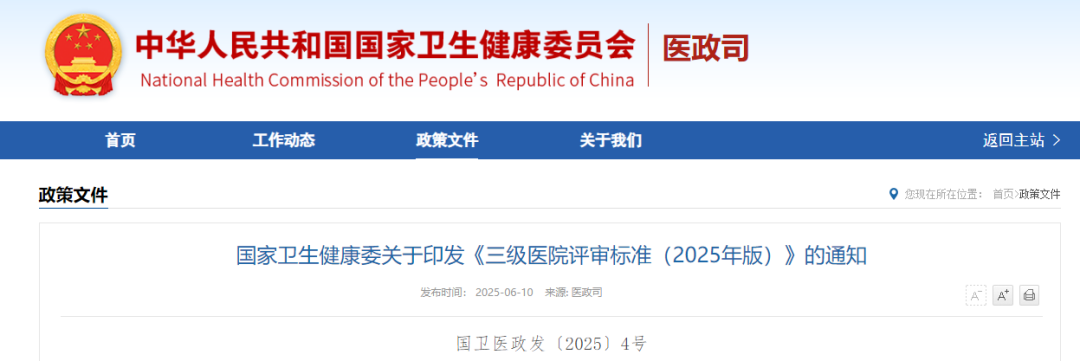 为持续推进医院评审工作,进一步引导三级医院落实功能定位,重点做好急危重症和疑难复杂疾病的诊疗服务,发挥在专科服务、技术创新、人才培养和对基层医疗卫生机构帮扶支持等方面的作用,深化质量内涵效率式发展,我委组织制定了《三级医院评审标准(2025年版)》。现印发给你们,请遵照执行。