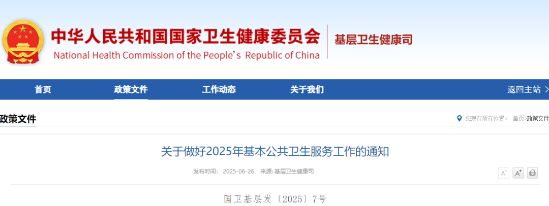 为深入贯彻党的二十届三中全会精神,落实新时代党的卫生与健康工作方针中以基层为重点、预防为主有关要求,持续提升基本公共卫生服务均等化水平,让群众可感可及,现就做好2025年基本公共卫生服务工作通知如下: