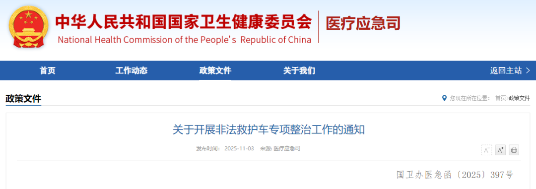 为规范救护车管理,严厉打击“黑救护”等违法违规行为,保障群众生命健康权益,按照《院前医疗急救管理办法》(国家卫生和计划生育委员会令第3号)等有关规定,决定开展非法救护车专项整治工作。现就有关事项通知如下: