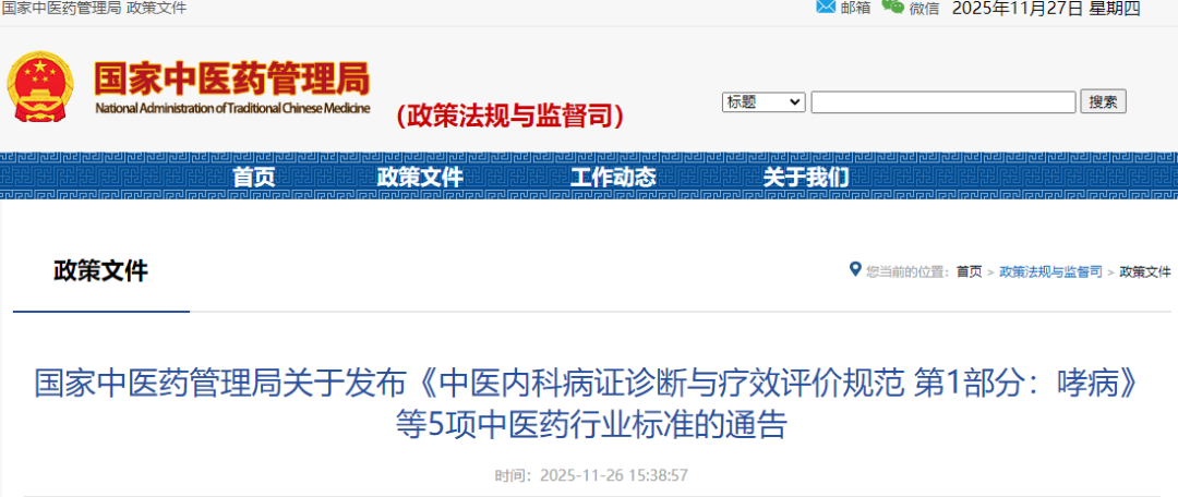 现发布《中医内科病证诊断与疗效评价规范 第1部分:哮病》等5项中医药行业标准,编号和名称如下: